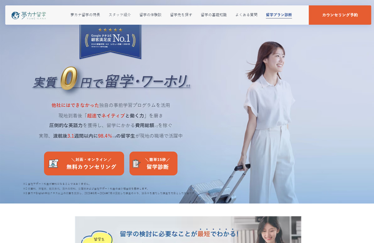 夢カナ留学では、この「0円留学」をサポートしていて、留学前の相談から帰国後のキャリア相談までしっかりサポートしてくれます。英語力や希望の行き先に合わせてプランを作ってくれるので、理想のプランに近づけられるのも魅力です。