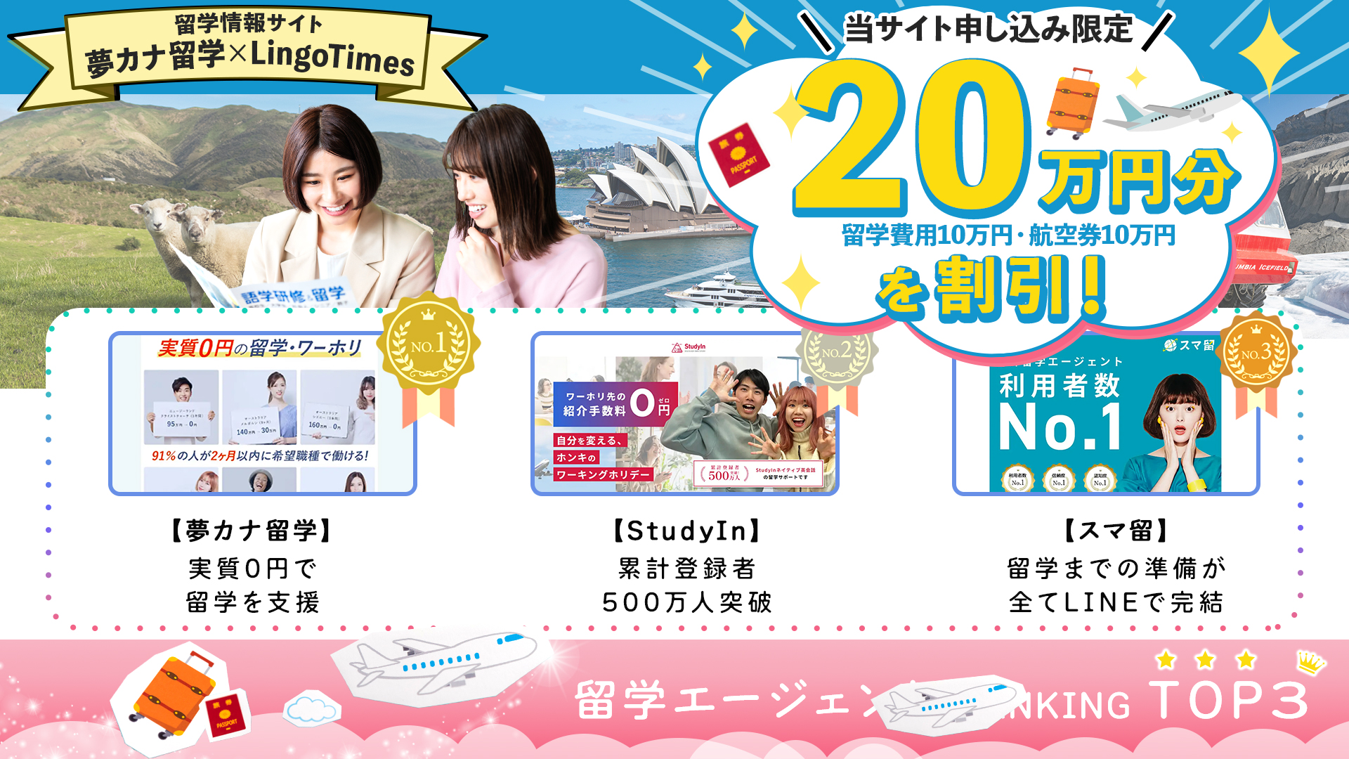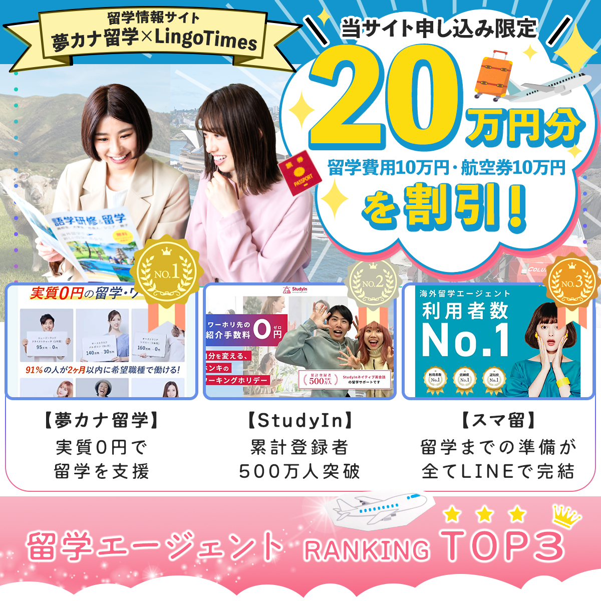 当サイトから「夢カナ留学」に留学の申し込みをしていただいた方に限定で、留学費用10万円+航空券10万円の合計20万円分が割引になります!